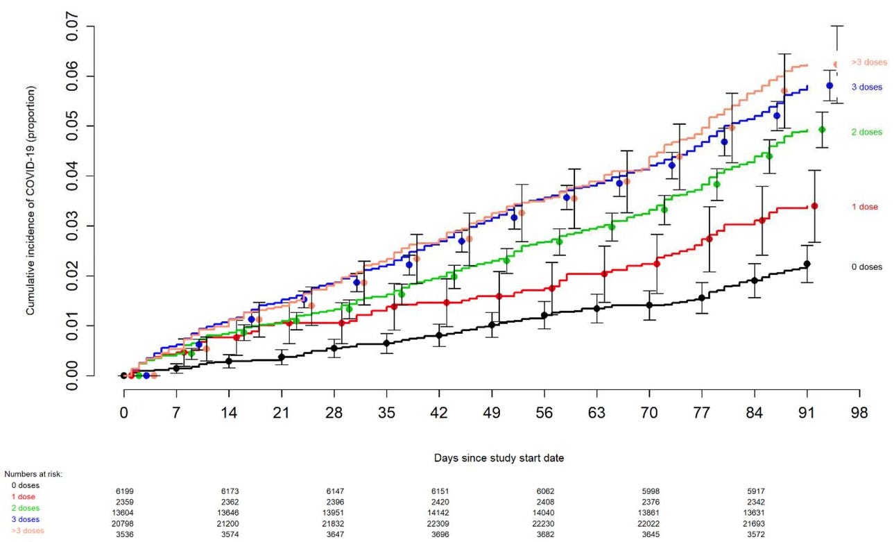 “The risk of COVID-19 also varied by the number of COVID-19 vaccine doses previously received. The higher the number of vaccines previously received, the higher the risk of contracting COVID-19 (Figure 2).”